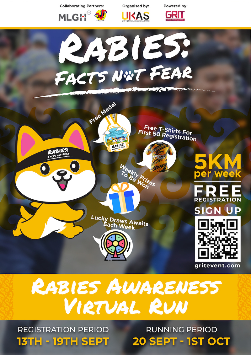 Unit Komunikasi Awam Sarawak (UKAS) in collaboration with Ministry of Local Government and Housing (MLGH) and Department of Veterinary Sarawak (DVSS) is organising a free-to-register Rabies Awareness Virtual Run that will take place between 20th September to 1st October 2021 which only require 5km distance covered every week for 2 consecutive weeks. This virtual run is organized in conjunction with World Rabies Day 2021 with the theme of “Rabies: Facts, not Fear ”. Runners from all walks of life from all over Sarawak are expected to participate.