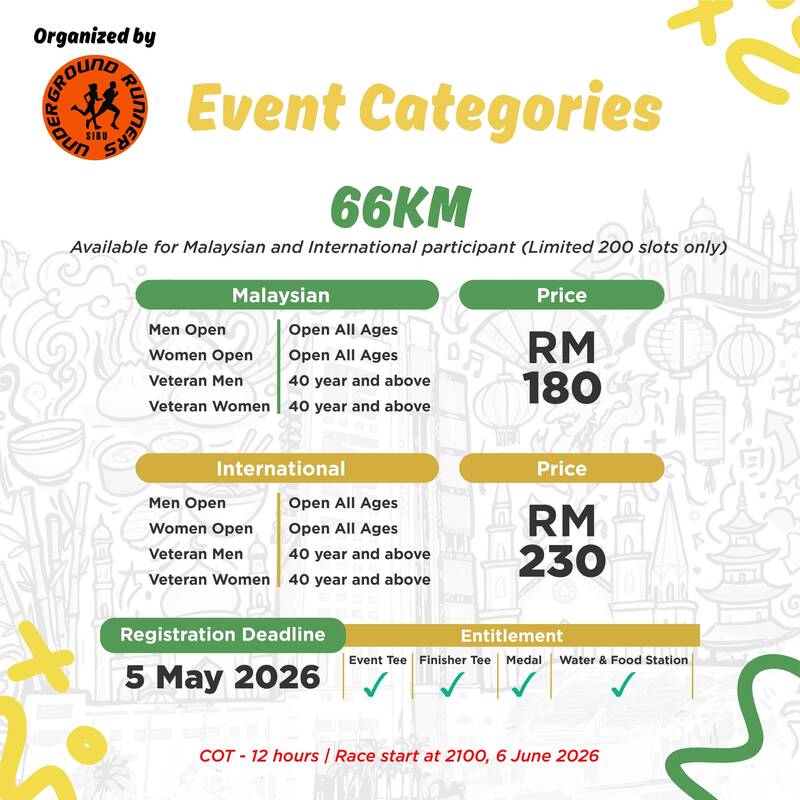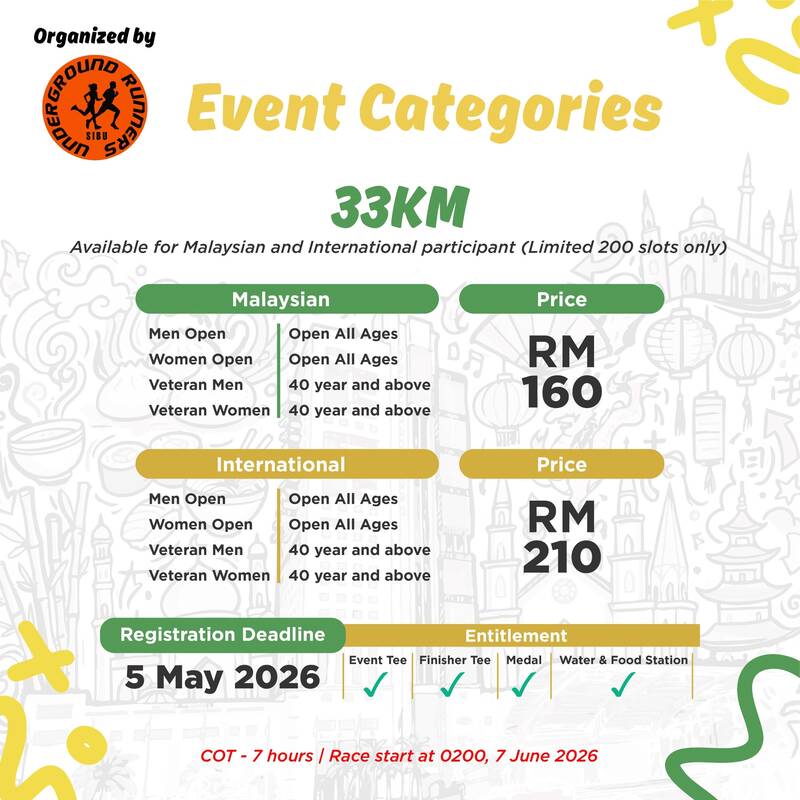 Choose your challenge with 66km or 33km road ultra distances, featuring a route that loops around the vibrant streets and landmarks of Sibu. Designed to be accessible yet demanding, Nam Nam Ultra is the perfect opportunity for first-time ultra runners—and a fresh challenge for seasoned athletes.